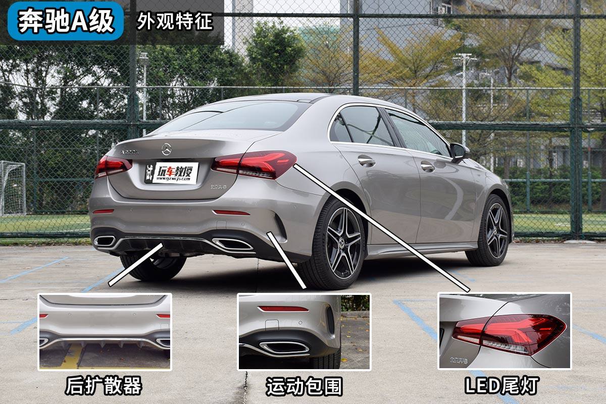 奔驰A级的设计还是偏向优雅,线条比较柔和。A级车尾的设计稍显简洁,运动套件包含了后扩散器、双出排气装饰和后轮散热口的装饰,这几样装饰都用于提升A级的运动气息,对性能提升有限。