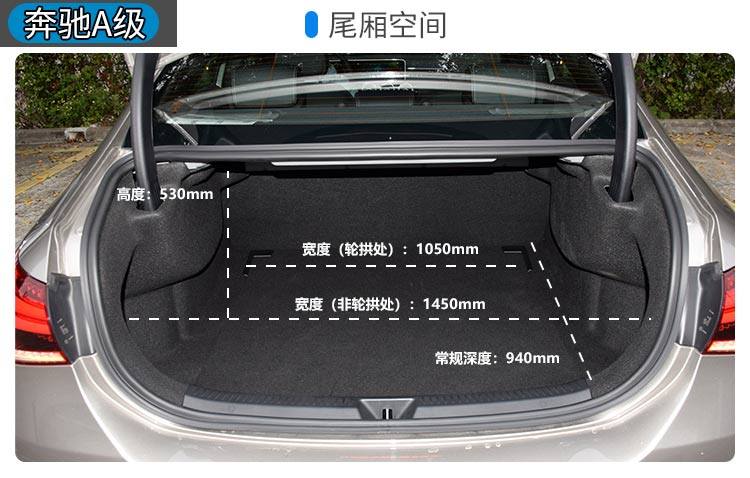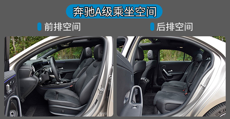 以乘坐空间来说,A级是三款车里,后排空间最大的一个。不过A级的头部空间较小,笔者(173cm)坐进去只能将座椅调低,靠背角度调大,坐姿变得有点半躺,有点像坐上了性能车一样。后排空间虽然大,不过座椅靠背角度比较直和座椅比较硬,实际也不适合长期乘坐。