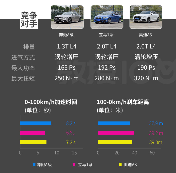 在动力这个环节,A级要吃一些亏,因为A级目前只有一款1.3T涡轮增压发动机(4缸),拿来跟宝马1系的1.5T和奥迪A3的1.4T来对比会比较合适。