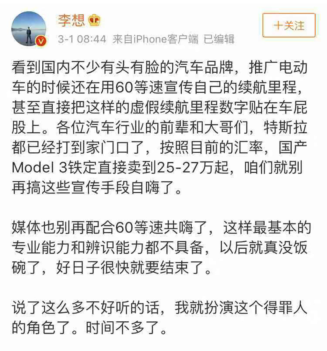 因此众多消费者对纯电动车的续航里程与安全性也一直都是颇有微词,而就在3月1日,车和家创始人李想也是实名对国内新能源车企以60Km/h等速宣传自己产品续航里程的做法进行了批评式点评: