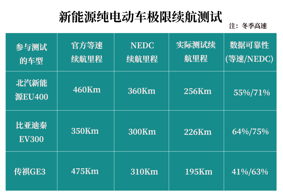 空口无凭,还需数据说话。据相关汽车媒体所作的纯电动车极限续航测试数据显示,在将温度、负载等因素融入测试,最终所测的实际续航里程与NEDC续航里程差距还是很明显的,基本可以说是在NEDC基础上打了个不小的折扣。但相对于官方的等速续航里程,NEDC的可靠性还是比较高的,值得用户信赖与参考。