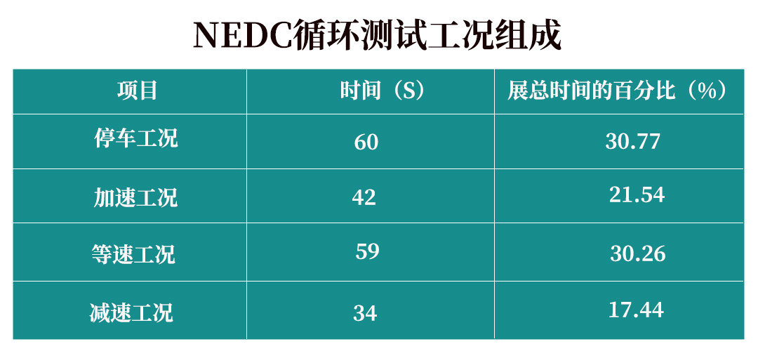 NEDC循环测试包含了4个市区循环和1个郊区循环,测试总时间近20分钟。其中,在循环测试过程中停车工况占30.77%;等速工况占30.26%;减速工况占17.44%,而加速工况则占了21.54%。