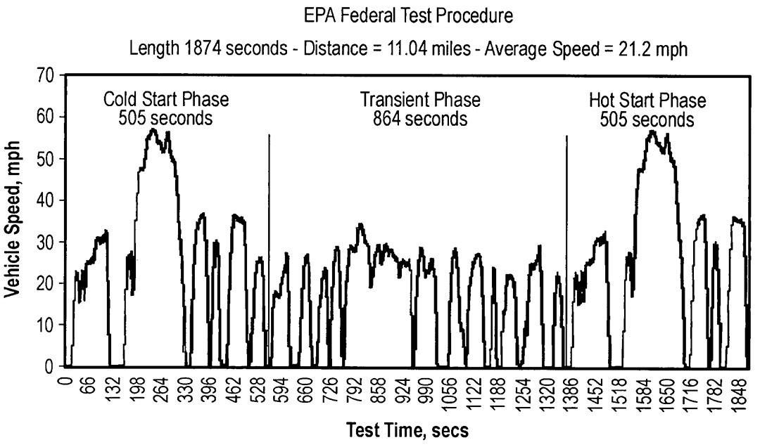 FTP-75循环测试标准是由美国环境保护局EPA(United States Environmental Protection Agency)制定的车辆测试程序,全程测试包括了市区工况、高速工况、高速加速工况与能量消耗相对较高的空调工况在内的4种工况循环。