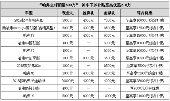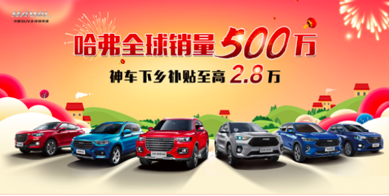 中国首个进入全球销量500万辆俱乐部的SUV品牌哈弗,于3月1日,宣布正式启动“哈弗全球销量500万 神车下乡补贴至高2.8万”钜惠活动,这是继春节期间5亿红包感恩回馈活动之后,哈弗更大力度的感恩行动,优惠再升级,旨在让更多消费者底价购车,圆高品质SUV梦。