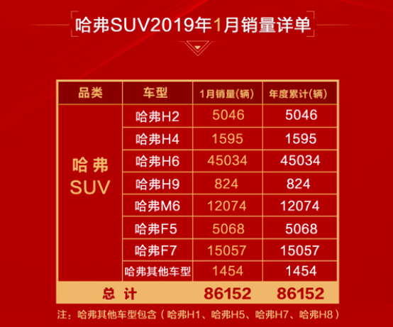 其中,1月,哈弗终端销量高达86,152辆,同比增长9.8%,突破历史同期销量纪录,喜迎开门红。其中,哈弗H6销售新车45,034辆,以大幅优势领跑市场,累计68个月SUV销量第一;“超值家用SUV”哈弗M6同比增长211.4%;“哈弗年轻化新名片”F7环比大增36.4%。2月,“新春开门红 2019哈弗春季抢购会”成功举办,活动当天即斩获逾1.5万订单。哈弗SUV在1-2月份的持续旺销,为哈弗品牌在2019年全年发展奠定了良好开局。