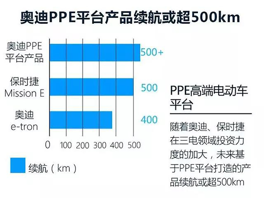 但奥迪似乎并未将所有”鸡蛋“都放在MEB这个篮子里,而是选择和保时捷合作研发PPE电动化平台,主攻B级到D级车的纯电产品市场,而基于PPE平台打造的产品,续航里程有望突破到500km。