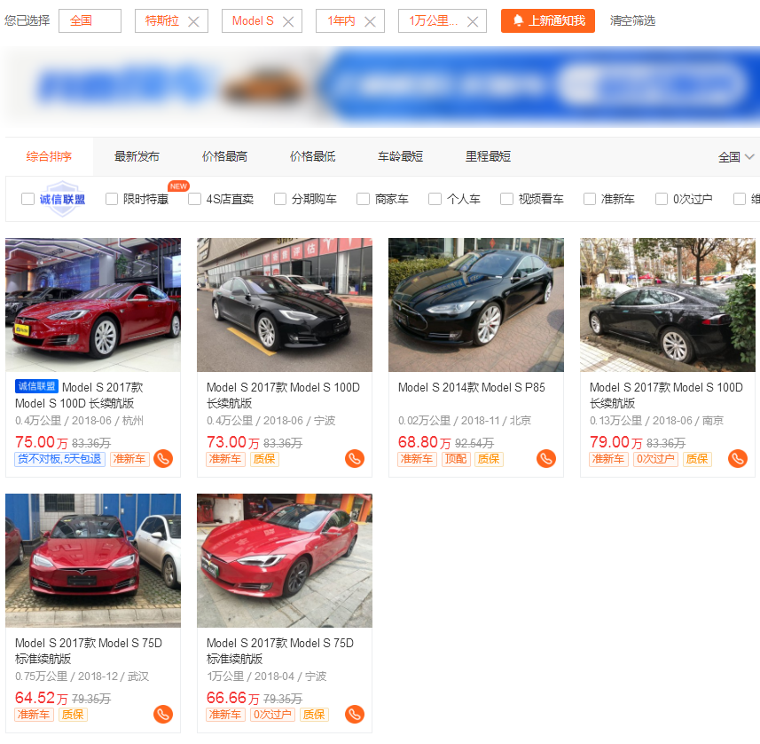 如果说觉得车商和二手车行的估价太坑,那么网络渠道也不失为一个好选择。也有不少的特斯拉车主选择吧自己的爱车挂在瓜子、二手车之家等网络平台上售卖。因此教授在二手车之家找了全国范围内的一万公里以内/一年以内的5台准新车,看看这些Model S的车主有多惨。