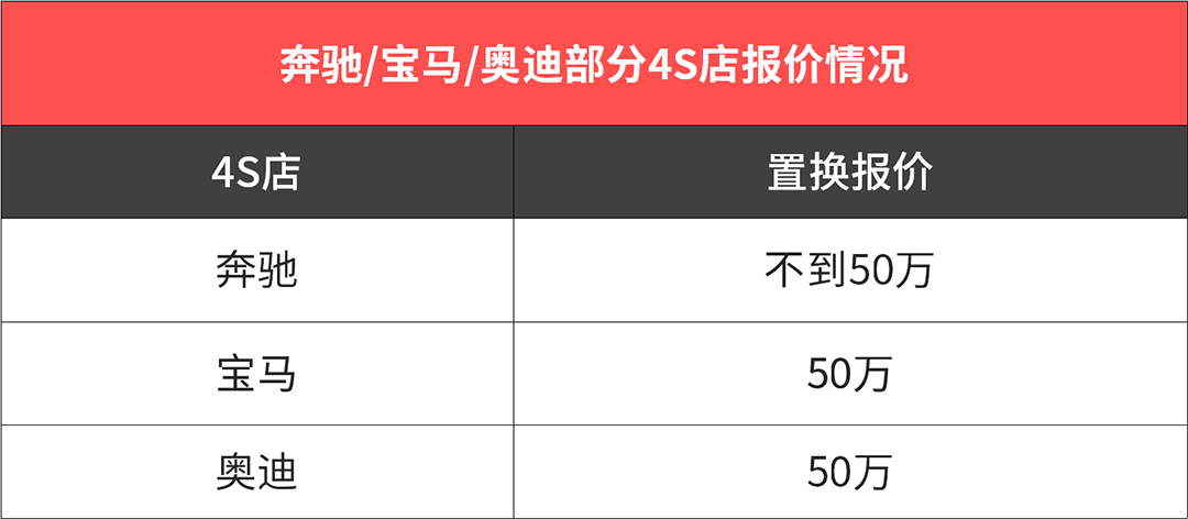 奥迪和宝马的4S店给出雷同的估价:50万,而奔驰的估价甚至不到50万元。如果按照4S店置换的情况来看的话,即便跟4S店的评估师唇枪舌战奋力抗争,贬值也是25万以上了。