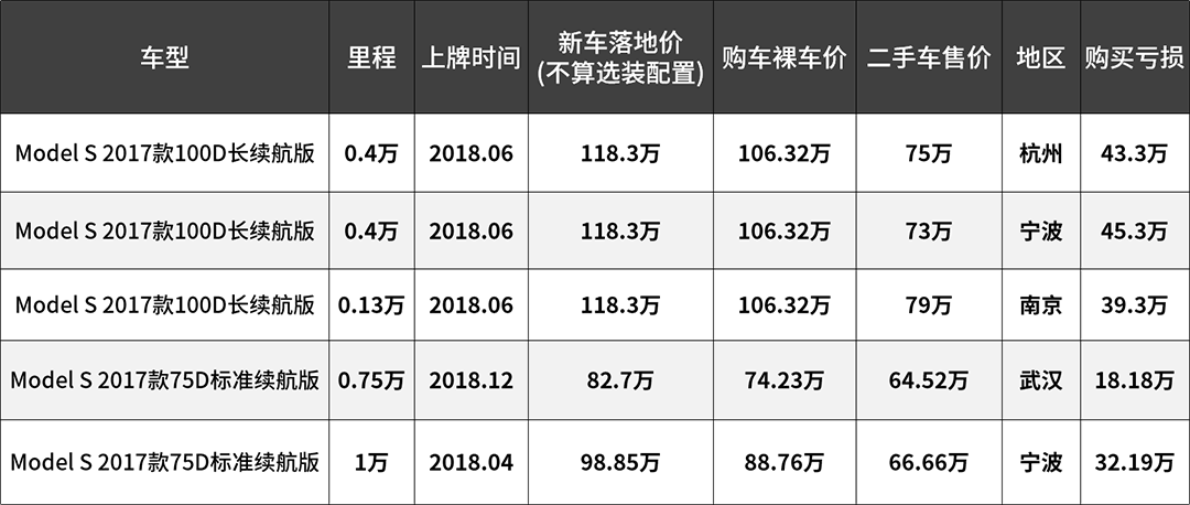 从表格上可以看到除去一台在2018年12月购买的75D之外,其它车主在一年不到的时间内至少都要承受25%以上的贬值,亏损32万以上;这还不算车主掏钱选装的其它配置。