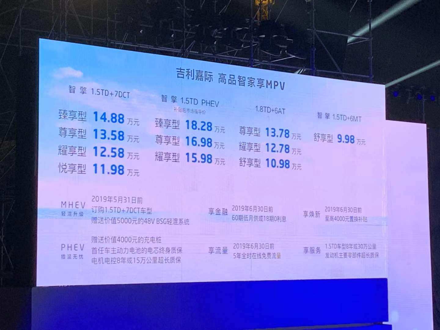3月11日,吉利首款MPV嘉际在广东珠海正式上市,新车售价9.98- 21.58万元(补贴前),提供2+2+2、2+2+3以及2+3+2三种座椅布局可选,动力方面提供1.5TD、1.8TD和1.5T PHEV共11款车型。新车上市后将与别克GL6,传祺GM6等主流MPV展开竞争。