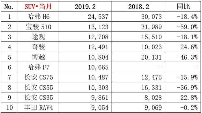 现在,我们就来看一下,2019年2月份国内SUV销量前10的一个具体情况。