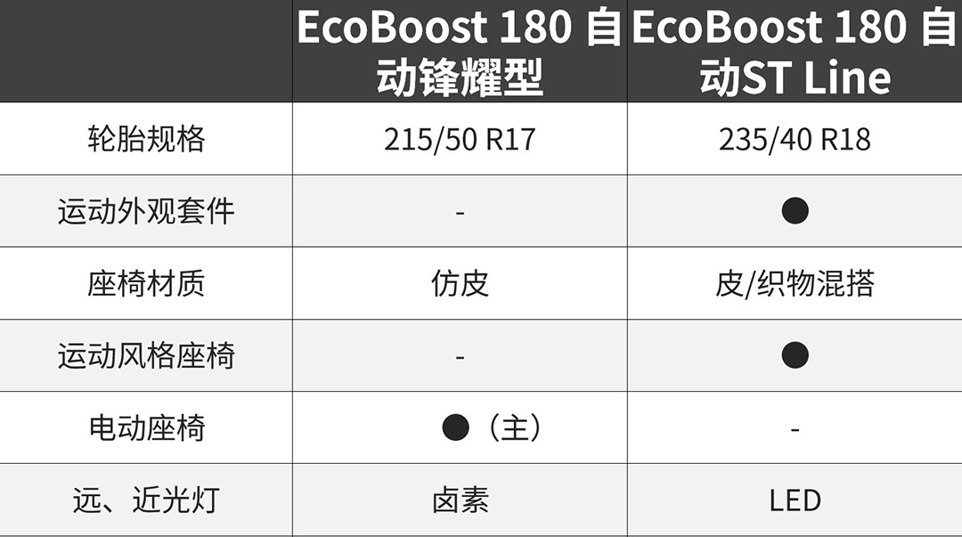 福克斯刚上市的时候我们就留意到了,福克斯的自动锋耀型与自动STline版本的价格是一样的。除了ST Line版本有运动化的外观套件、更大更动感的轮圈和皮/织物混搭的运动座椅外,最可怕的是ST Line还有LED大灯,对你没看错ST Line版本还有LED大灯!然而,自动锋耀版就多了个电动座椅,还是只有主驾驶位的。福特是以为我们买车都不看配置表的吗???