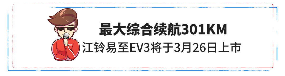 我们从相关渠道获悉,江铃新能源旗下微型电动车易至EV3将于3月26日正式上市。据悉,新车将推出高、低功率两种动力版本共4种配置车型,两种动力版本车型均搭载了容量为31kWh的电池组,其中低功率版本车型综合续航为301km,高功率版本车型综合续航为251km。作为微型电动车,易至EV3拥有时尚的外观与内饰,以及较为智能的车机,再加上最高301km的综合续航,易至EV3能满足一般年轻人城内代步的需求。(图片来源:易车)