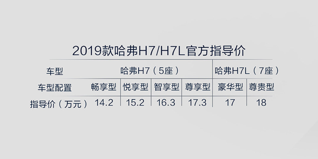 3月12日,2019款哈弗H7/H7L正式上市,售14.2-18万元,售价基本与老款车型维持在一个水平,只是新增畅享型和尊享型两款车型,进一步降低购车门槛。作为年度改款车型,2019款哈弗H7/H7L的变化并不大,依旧搭载2.0T发动机,但传动系统由此前的6DCT变速箱换上了7DCT变速箱,7个档位齿比绵密,换挡更迅速,传动效率更高,更省油;官方指出经过全新调校的动力系统使得哈弗H7的百公里油耗仅为8.0L。