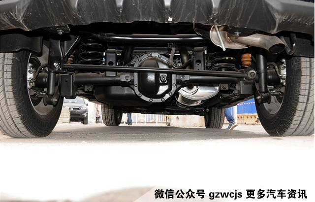 爱腾采用非承载式车身,前双叉臂式螺旋弹簧悬挂、后五连杆式非独立悬挂(人们常说的整体桥式),都是十分硬派的越野车设计,前后悬挂可以面对越野路面时有较大的变形空间,从而适应起伏的路面,提高越野性能。
