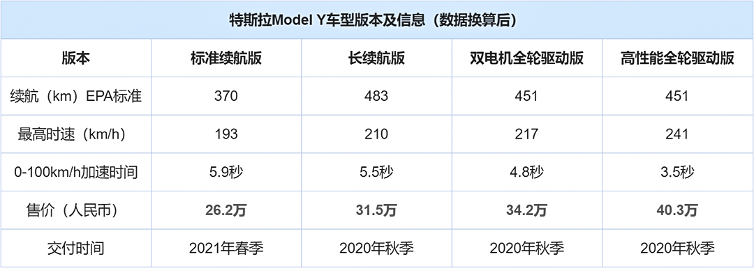 作为特斯拉第五款量产车型,Model Y定位五门中型SUV,售价为3.9万-6.0万美元,共拥有四个配置版本(供七座布局选装),分别为标准续航版、长续航版、双电机全轮驱动版和Performance高性能全轮驱动版,中国地区预售价43.5-52.6万元起,其中标准巡航版未公布。
