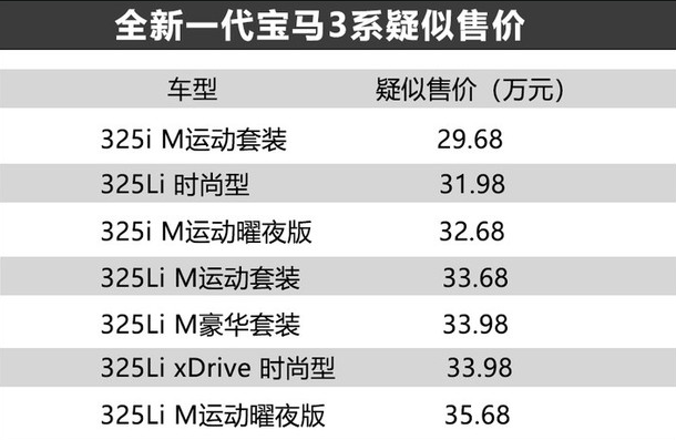 日前,华晨宝马的全新3系已经正式投产下线,搭载B48 2.0T发动机,匹配ZF8AT变速箱;同时,网上也放出了“疑似售价”,售价区间约30—36万,跟现款的指导价相仿,入门款甚至还要低1.3万(终端售价另谈),而且最快会在下月上市,我们觉得推测也是八九不离十了,相信对于豪华中型车来说,必然又会是另一番激烈争斗。