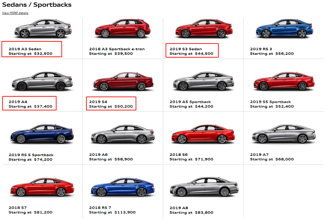 也就是说在美国,如果你打算买一辆奥迪A3,你咬一咬牙,只需多花的3分之1,就可以买到一辆性能车奥迪S3!奥迪A4和奥迪S4的起步价也是一个差不多的差价幅度。
