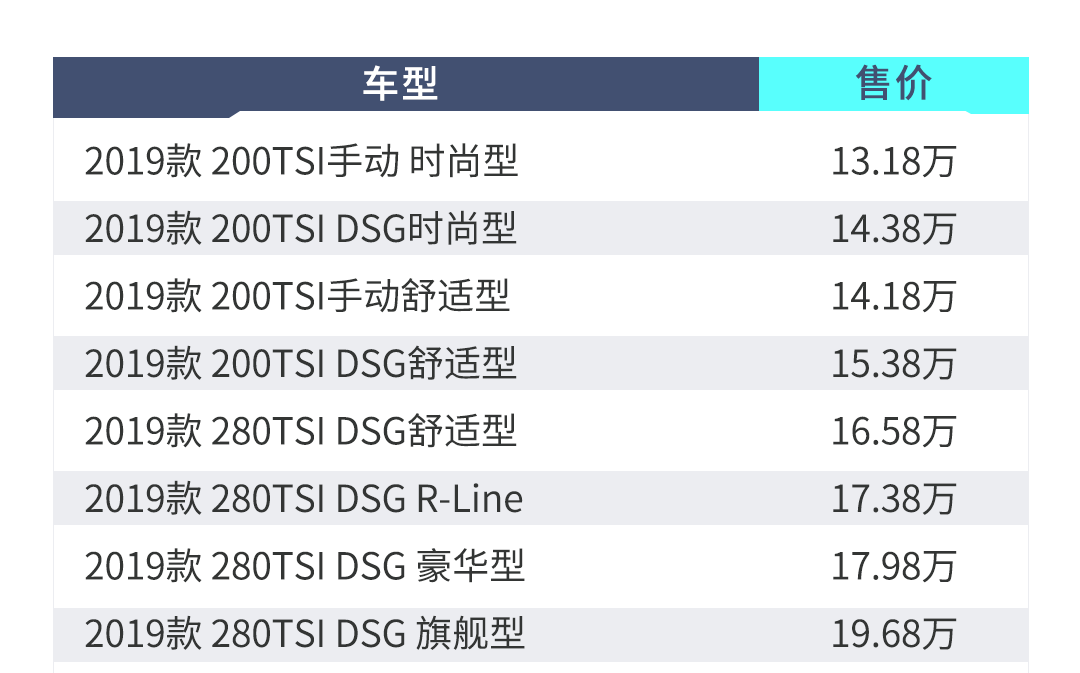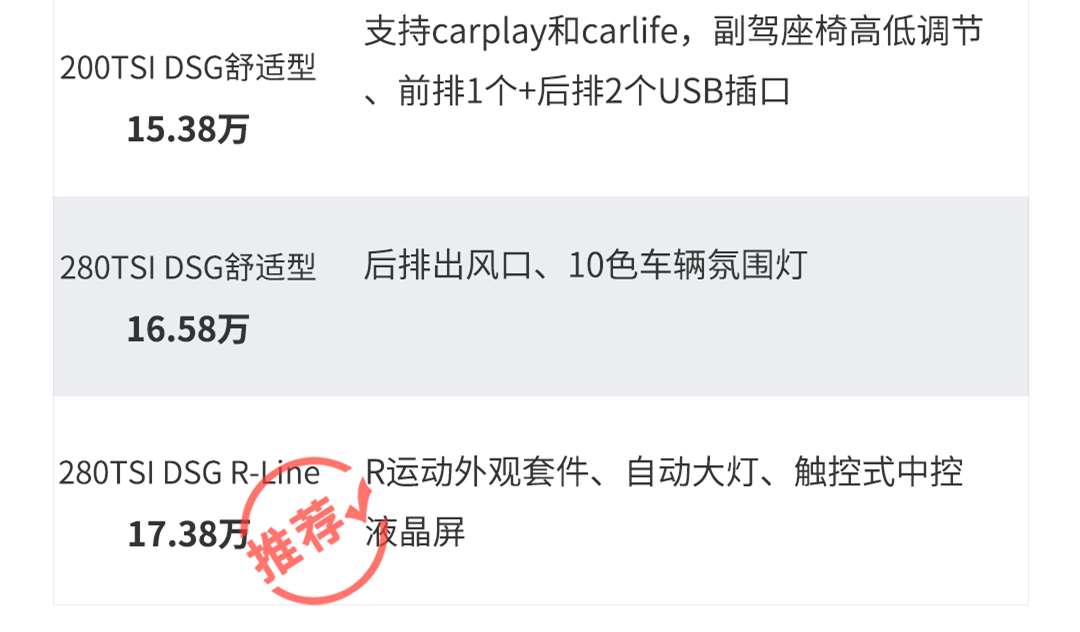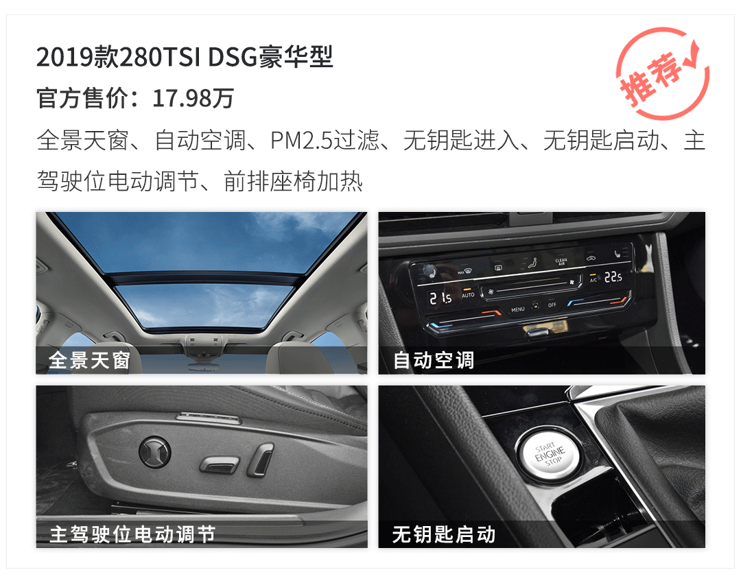 个人最为推荐的是280TSI豪华型,全景天窗、自动空调、无钥匙启动、电动座椅等配置既实用,同时又是国人的最爱,我们只有购买这一配置车型,才能同时获得这些配置。而且17.98万的指导价,在终端优惠过后,大家还是可以接受的。此外,带有R运动套件的R-Line车型也值得推荐。