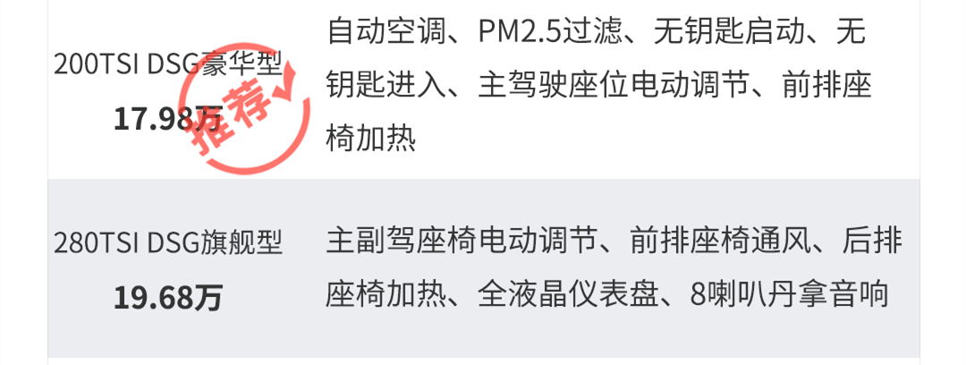 全系的200TSI车型也就是1.2T车型,个人都不太推荐,首先基础排量实在太小,动力参数也有点弱,并且低配时尚型缺少了诸如后排空调出风口等很多必备的舒适性配置。280TSI也就是1.4T车型的低配舒适性和顶配旗舰型也不推荐,原因是舒适型多加一万多一点的价钱就能得到R-Line车型帅气的外观套件或者豪华型的自动空调、电动座椅和加热等很实用的配置,而顶配旗舰型的售价太高,估计把钱都花在了丹拿音响上,就剩下全液晶仪表盘比较吸引人,但其它配置都可以选装。