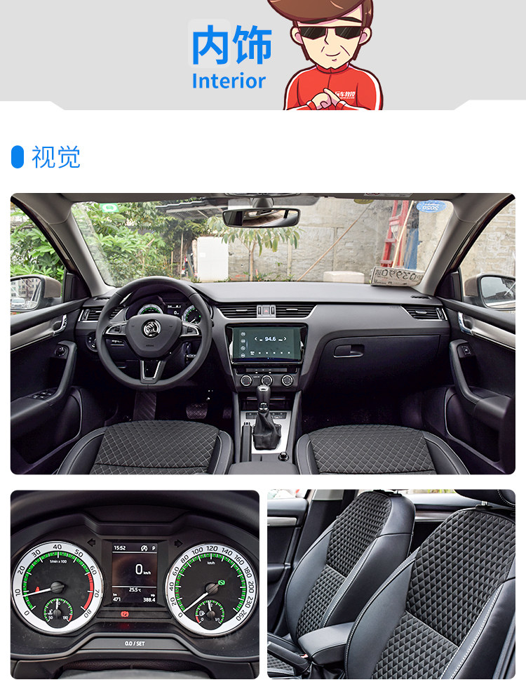 明锐的内饰比外观容易接受很多,线条和布局都很工整,没任何突兀,一些地方做得更有特色,譬如白绿相接的仪表盘和菱形格子状的坐垫,看起来很有质感和辨识度,这点值得肯定