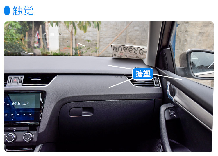 内饰用料超出预期,中控台和上方的面板都是搪塑材料,虽然不是很柔软细腻,但总比全硬塑要好,还是有一丢丢档次感的