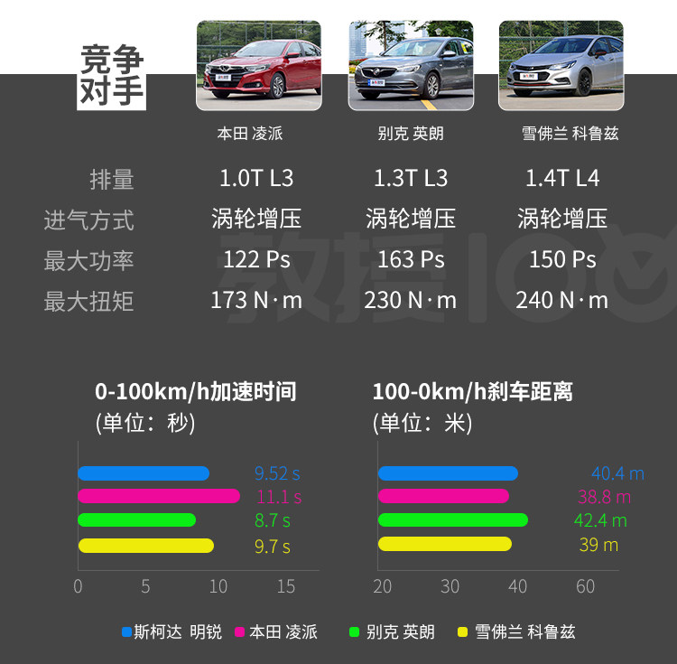 对比车型都是测试过的,都是高配车型,明锐的表现算是中规中矩,英朗是赢在排量优势,科鲁兹是输在变速箱跟不上,其实现在三缸车越来越主流,动力性能基本持平,特别强的动力只能出现在思域这样的车上