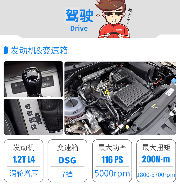 这具1.2T配7DSG变速箱,早前就已经在速腾的1.2T车型体验,是一套相当成熟而且可靠的动力系统,尤其是变速箱,换代干脆,真的只有大众的双离合能够做到这样的,但是你要说动力很强,其实是不存在的,初段不是特别灵敏,爆发力不强,这毕竟只有1.2的排量,也是正常的,但中后段的推背感和提速能力是接近1.8L自吸这样的水平,倒也不会觉得羸弱。