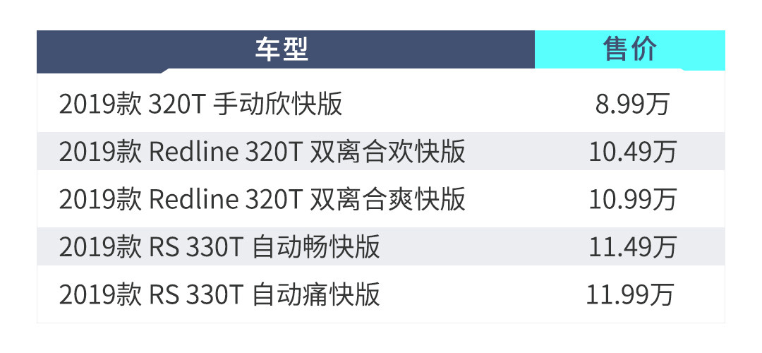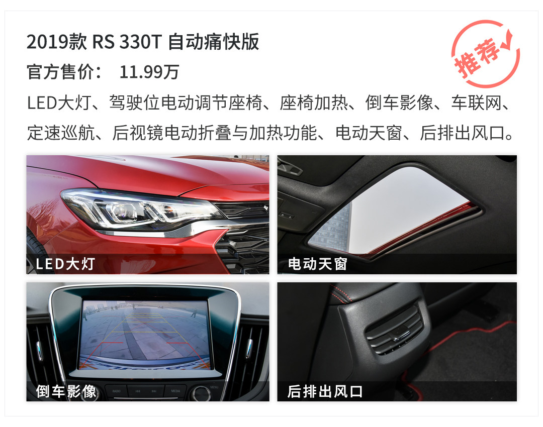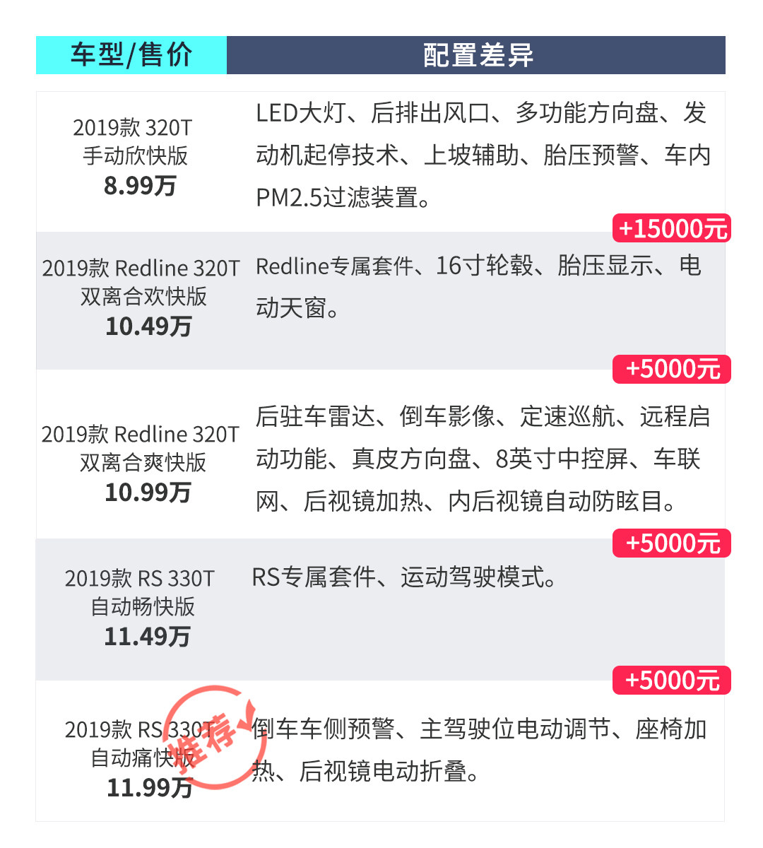 由于Redline和RS每款车型之间售价非常接近,且Redline 320T 双离合爽快版和RS 330T 自动畅快版之间没有太多的配置提升,所以个人更推荐RS 330T 自动痛快版,座椅电动调节和座椅加热等也是日常驾车时比较常用的便利性配置。