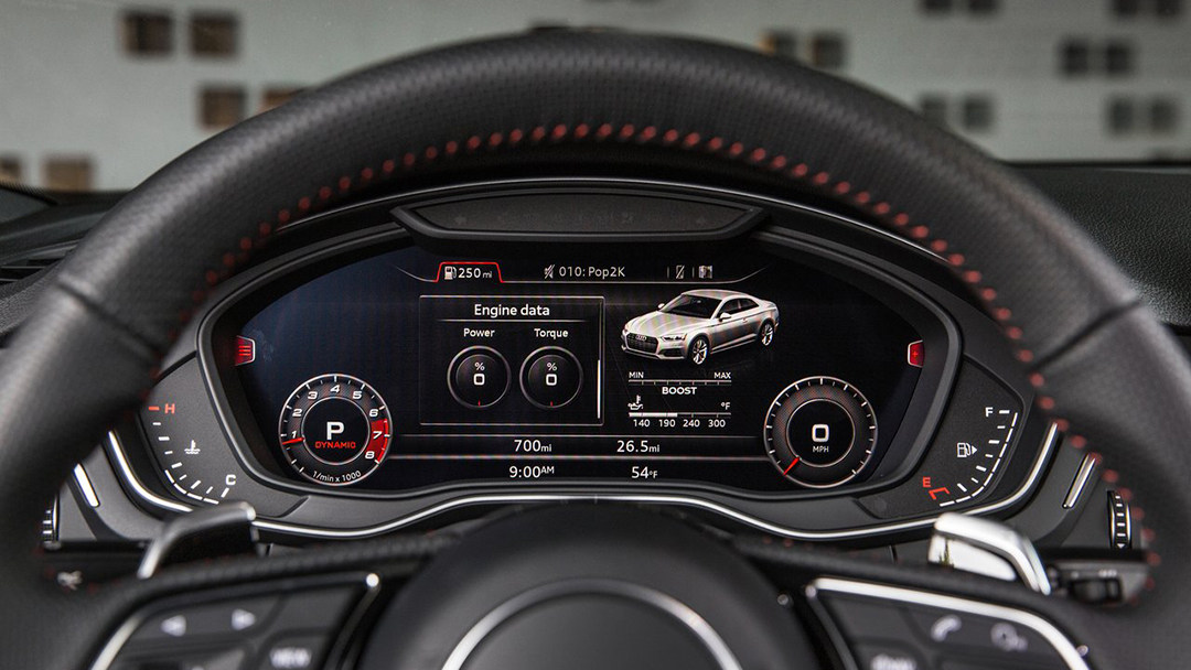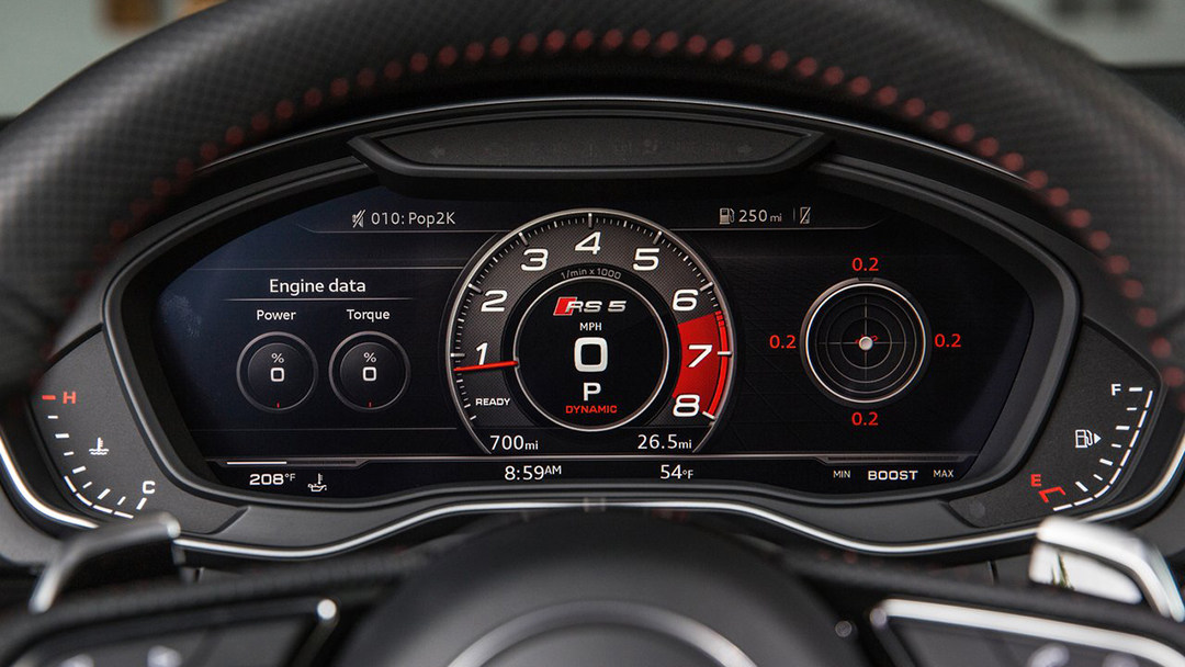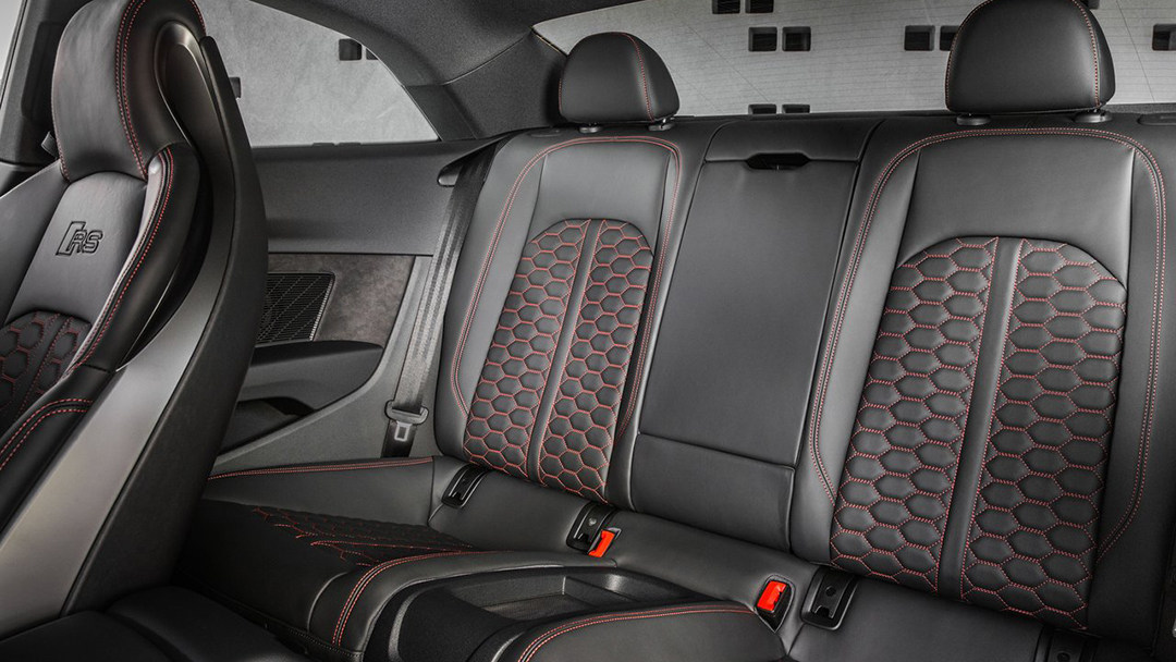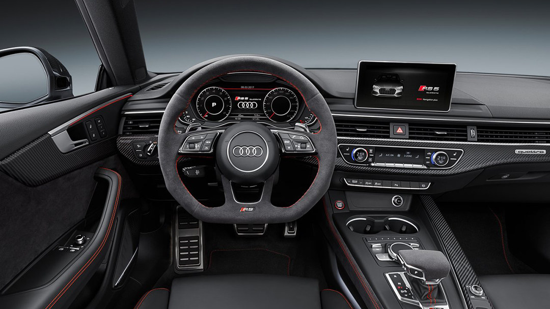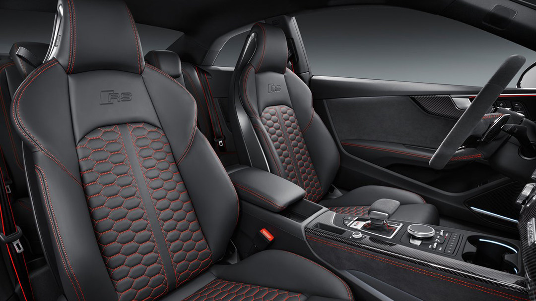 RS5 Coupe基本沿用了A5的内饰设计,环抱式额设计加上推杆式电子挡把颇似战斗机,细节方面却有着诸多不同,例如采用了更多碳纤维装饰、方向盘采用了翻毛皮包裹,以及表链纹理真皮座椅,它还带有红色缝线,这种小趣味还体现在安全带上。