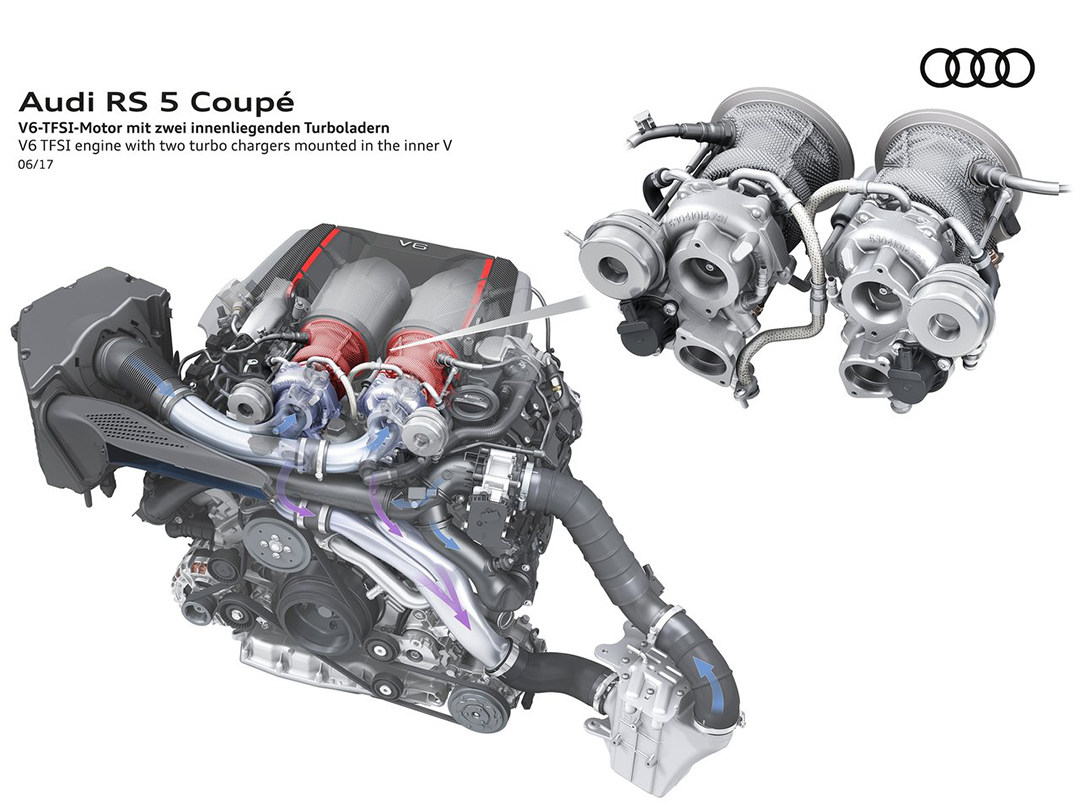 在动力方面,奥迪RS5 Coupe搭载了全新2.9T双涡轮增压V6发动机,需要注意一下关键词,“2.9T”、“双涡轮增压”、“V6”,这是否很熟悉?是的,这一发动机就是保时捷主导研发的2.9T发动机。