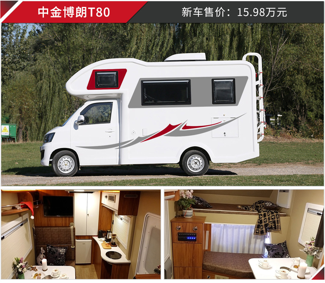 中金博朗T80房车是一款主打经济适用的小型自行式房车,长宽高分别为5355/2015/2800mm,轴距为2960mm。不过该车的动力较弱,仅搭载1.5L自吸发动机,最大功率102马力。