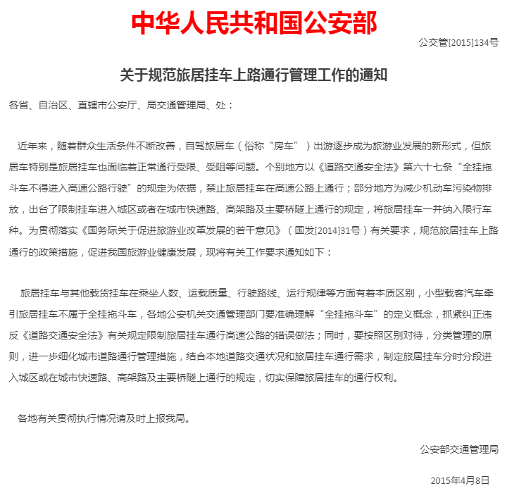 公安部2015年4月发布的《关于规范旅居挂车上路通行管理工作的通知》,已经解禁了很多之前对房车的禁令,比如上高速、进入城区等,让房车的出行更加便利。