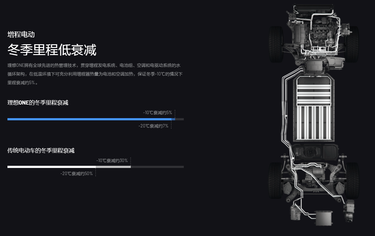 而理想ONE的增程式技术还解决了电动车冬季里程衰减的问题,理想与法雷奥(Valeo)联合开发了一套热管理系统,通过贯穿增程式系统、电池组跟电驱动系统的水循环架构,让增程器工作时的热量得以充分利用。对比零下10度的特斯拉Model X,开了空调里程衰减会超出30%,而ONE的里程衰减则低于5%。如果是零下20度,一般电动车会衰减50%甚至无法启动,而ONE的衰减则低于7%。并且由于增程式电车的电池寿命衰减更低,比起二手残值率更低的纯电动车,外加700公里的增程续航,理想ONE声称保值率跟燃油车无异。