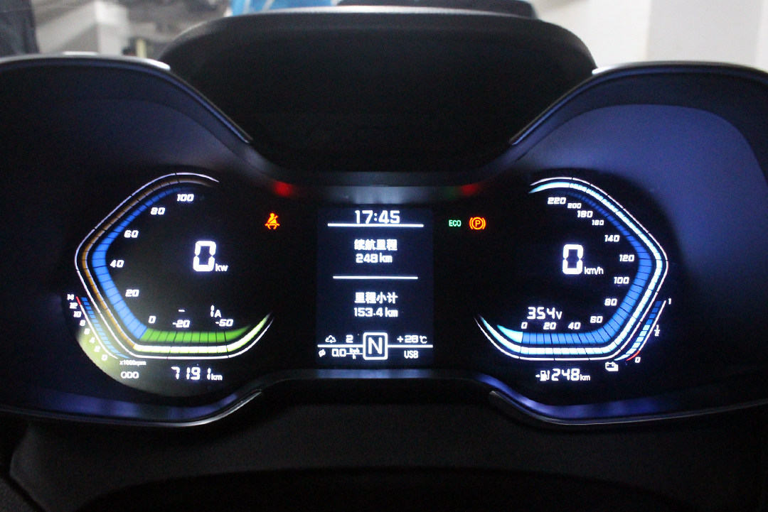 总共行驶了153.4km,行车电脑显示的续航里程减少了162km,表显剩余的续航里程还有248km。通过计算可以得出每实际行驶1公里,表显续航就减少约1.059公里,通过技术可得它在我们手上的真实续航里程为387km!