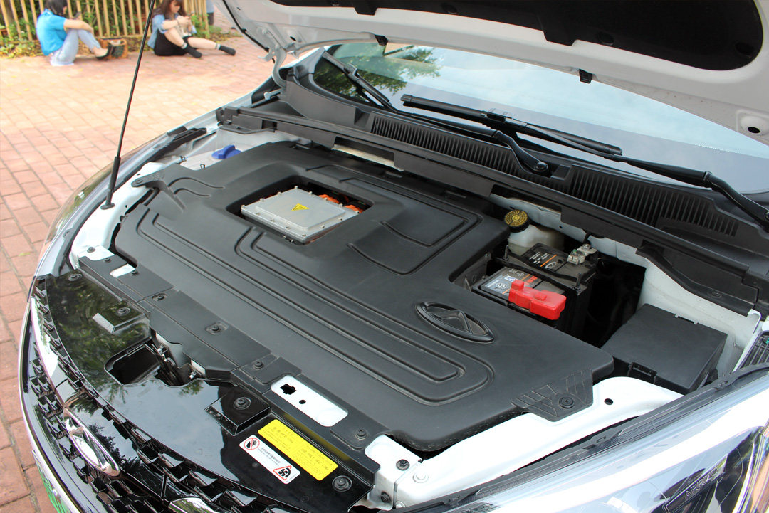 教授特意观察艾瑞泽5e的车身布局,它的电动机布局在发动机舱内,并且盖板包裹严实。而电池组则布局在车底,它采用了金属外壳包裹,而且包裹得挺严实的。