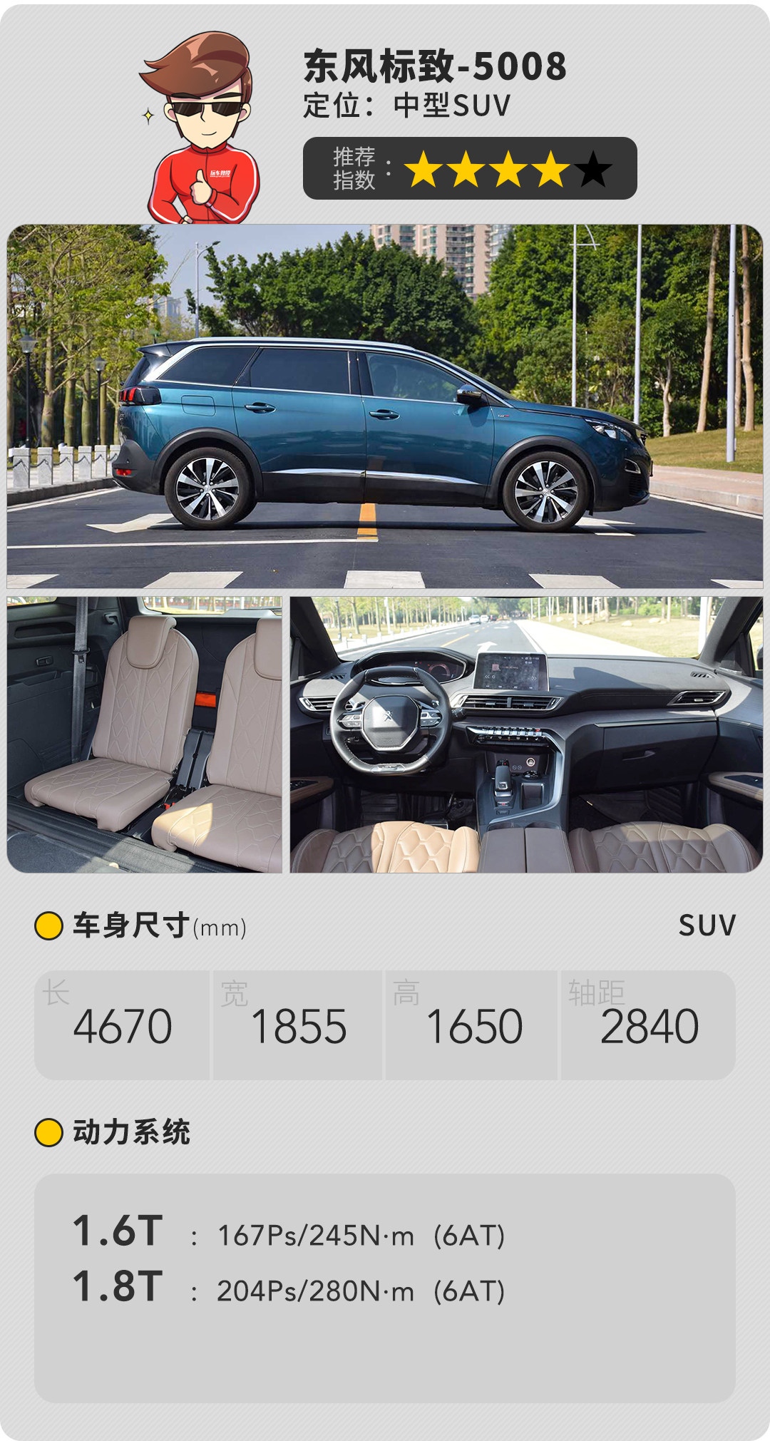 作为标致旗下首款中型7座SUV车型,不仅在设计上延续了很多4008上的个性样式,而且在诸多细节上的处理以及配置表现上都颇有亮点,可以说这不只是一台满足家用的大空间高舒适的SUV那么简单。而且法系车过硬的底盘调校以及涡轮技术让5008有着非常好的驾驭感受。追求有颜值有个性,又注重驾驶乐趣和兼顾实用性的车型,不妨留意一下。