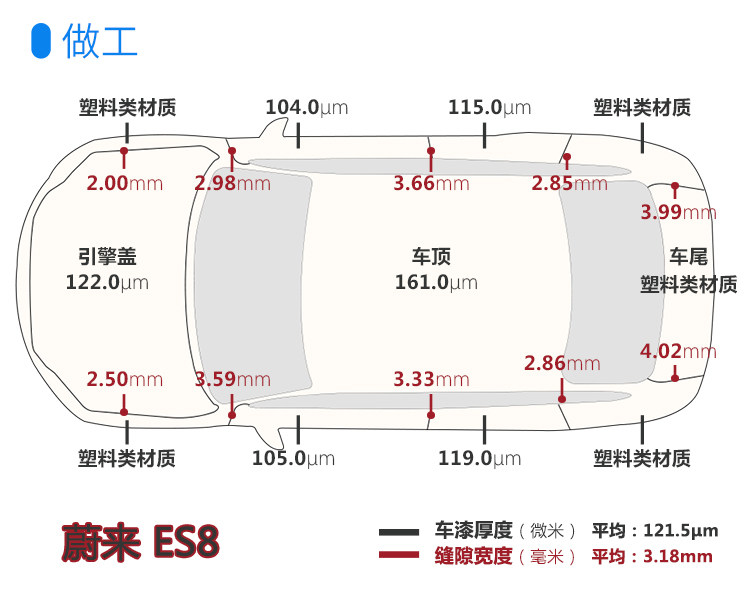教授实测发现,蔚来ES 8的车漆厚度范围误差(全距)为57μm,缝隙宽度范围误差是2.02mm。