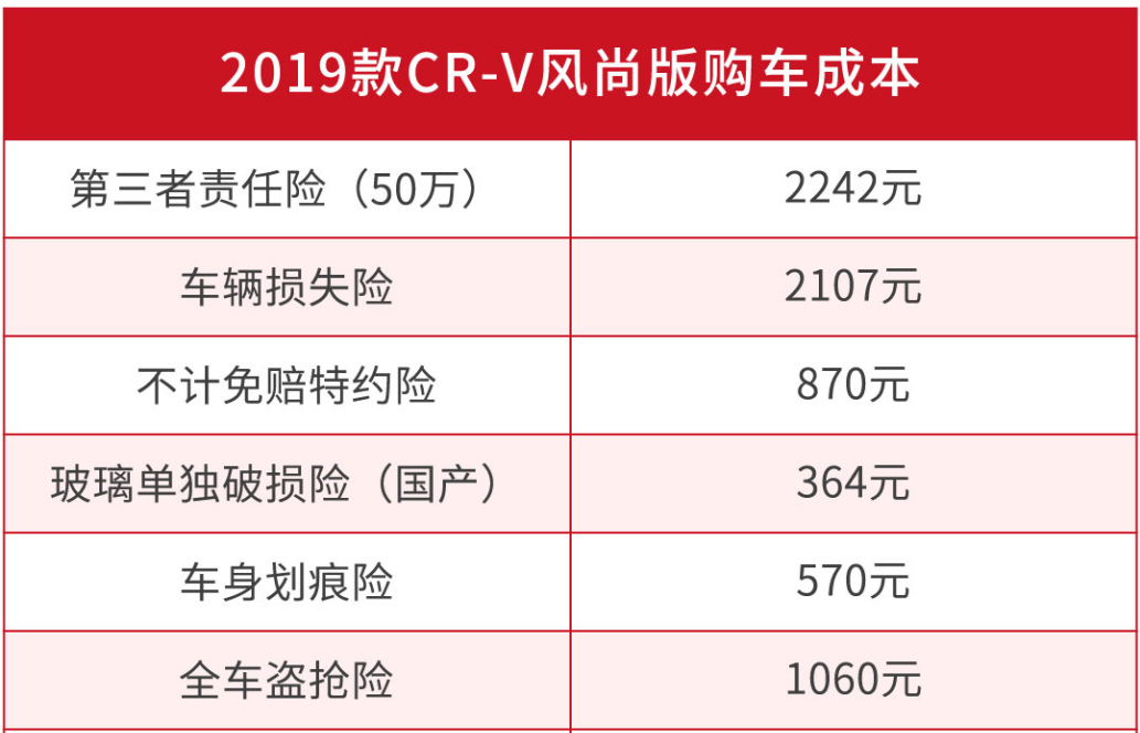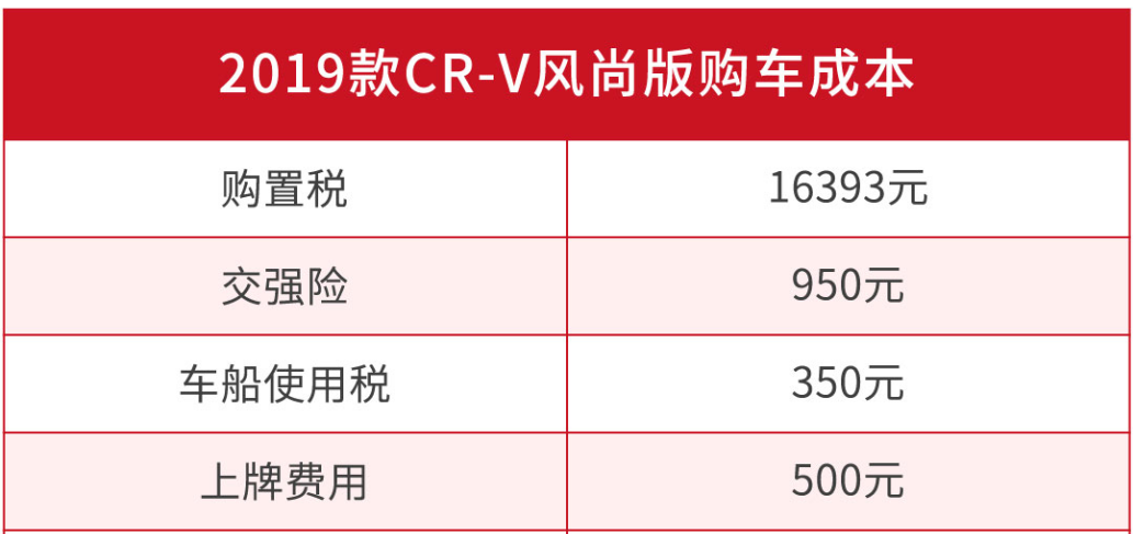 本田CR-V 2019款 240TURBO CVT 两驱 风尚版的指导价格是20.38万,像广州等部分城市在终端有报出1.2万的优惠(实际以4S店报价为准),那么优惠完价格在19.18万左右,这里就以19.18万的裸车价为准。