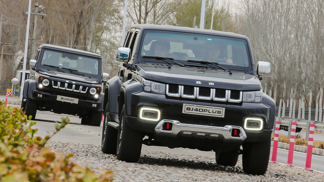 在电影《战狼》中给观众留下深刻印象的BJ40(左)以及最新一代军用越野车BJ80(右)。