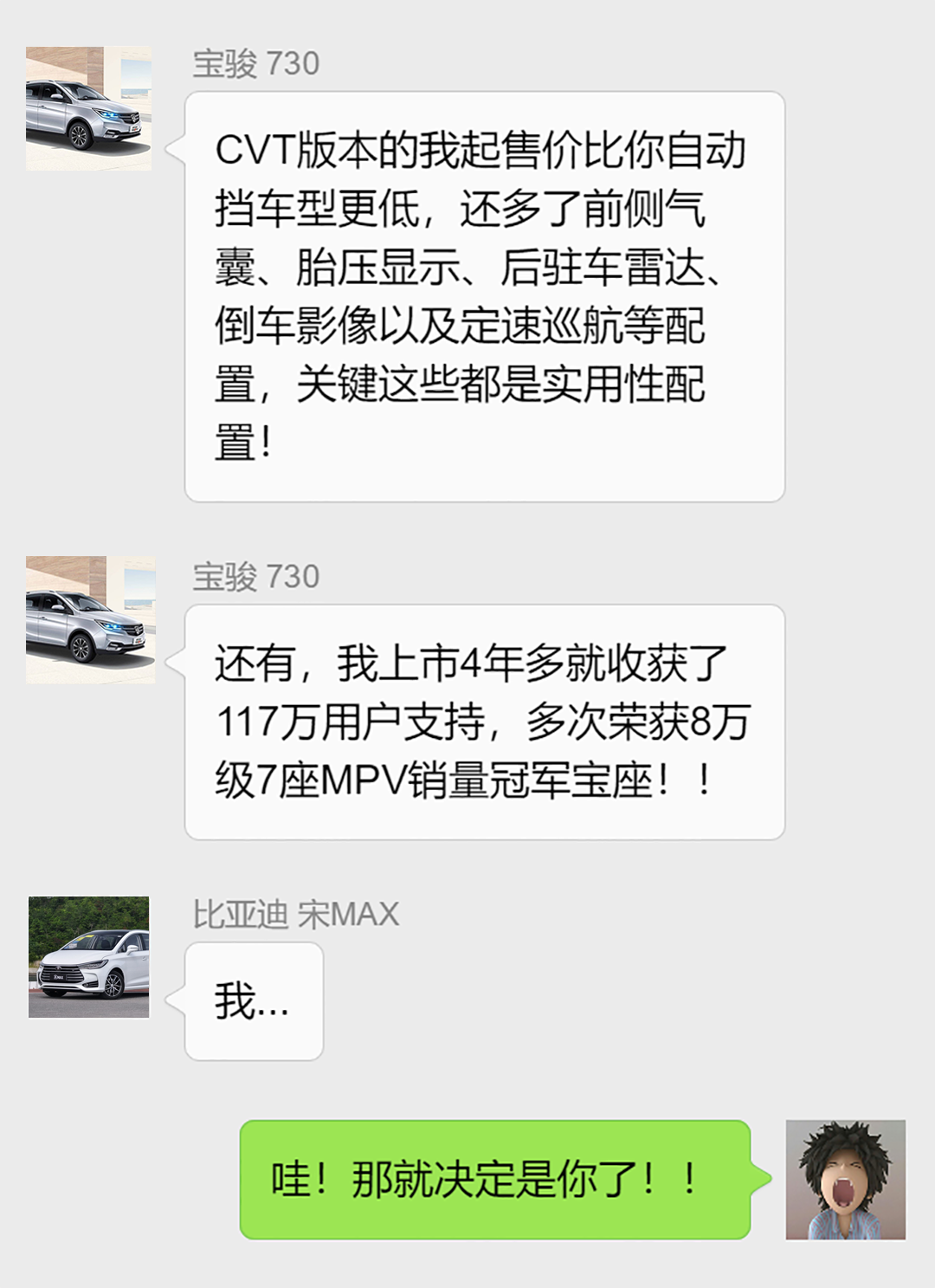 在教授看来,小明是如今日益壮大的二孩家庭用户的缩影之一。随着政策放开,二孩家庭们越发增多,他们对汽车需求更高,对实用性要求更大,一般轿车或者SUV已经很难满足他们需求。宝骏730亦或是比亚迪宋MAX,就是这些需求的解决方法,其中宝骏730明显更懂中国家庭用户,有着更出色的硬件以及实用性。正因为如此,宝骏730才能短短4年时间就获得了超117万用户支持,是该细分市场不折不扣的行业标杆。
