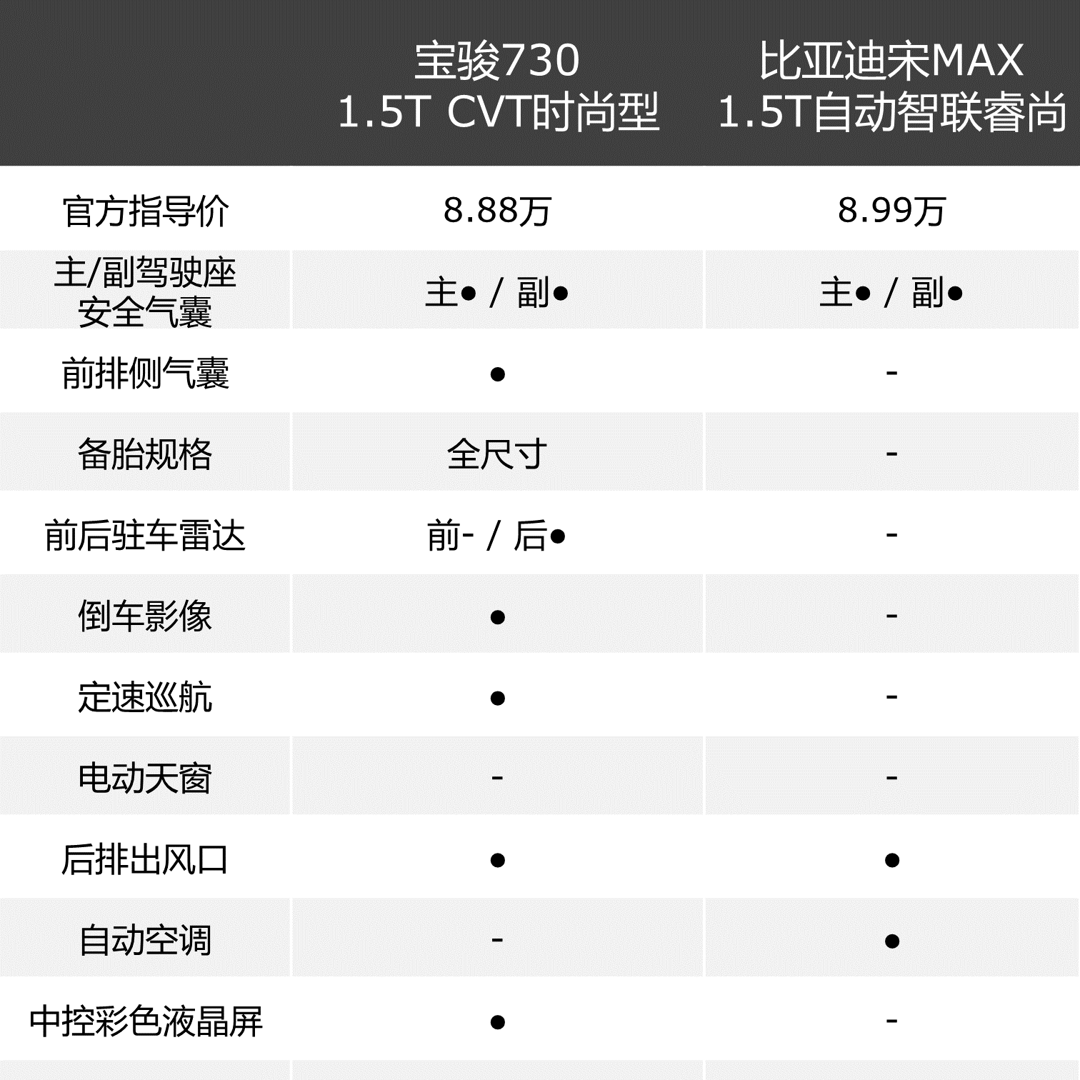 我选择了官方指导价8.88万的宝骏730 1.5T CVT时尚型 7座,相比8.99万的比亚迪宋MAX,两者配置各有千秋,但宝骏730诸如胎压显示、倒车雷达、倒车影像以及定速巡航这些配置更为实用。若是我选择9.98万的1.5T CVT旗舰型还可以多出更多配置,甚至还有宋MAX不具备的后独立悬架。