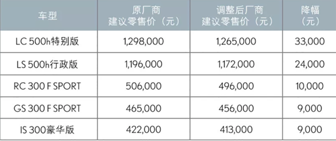 雷克萨斯仅下调部分车型,其中LC500h特别版最高降幅达33000元,LS 500h行政版降幅达到24000元,至于热销的雷克萨斯ES、雷克萨斯RX以及前不久上市的雷克萨斯UX等车型,价格还是维持原来不变。