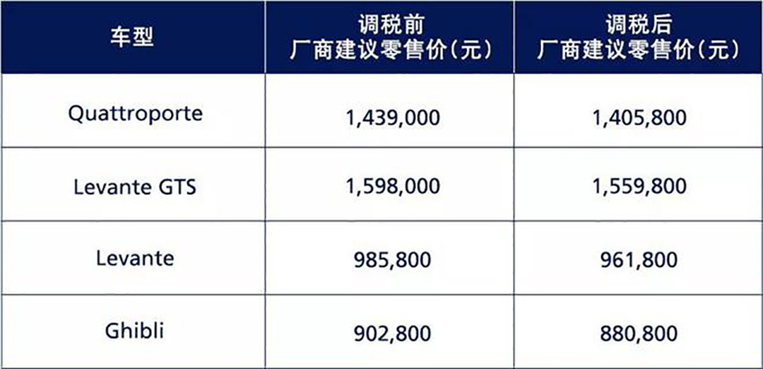 玛莎拉蒂也下调了中国市场全部在售车型的厂商建议零售价,其中Quattroporte总裁系列降价达3.32万元,Ghibli2.2万元,Levante降价2.4万元,Levante GTS降价3.82万元。