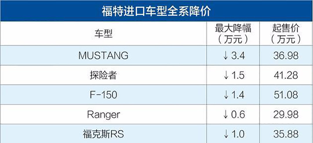 福特进口车方面,全新福特Mustang全系车型最高降幅3.4万元;新福特探险者全系车型最高降幅1.5万元起;F150猛禽越野皮卡,全系车型最高降幅1.4万元。