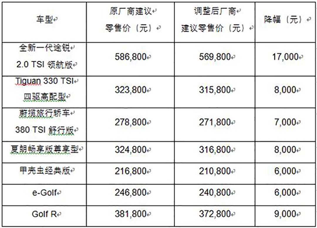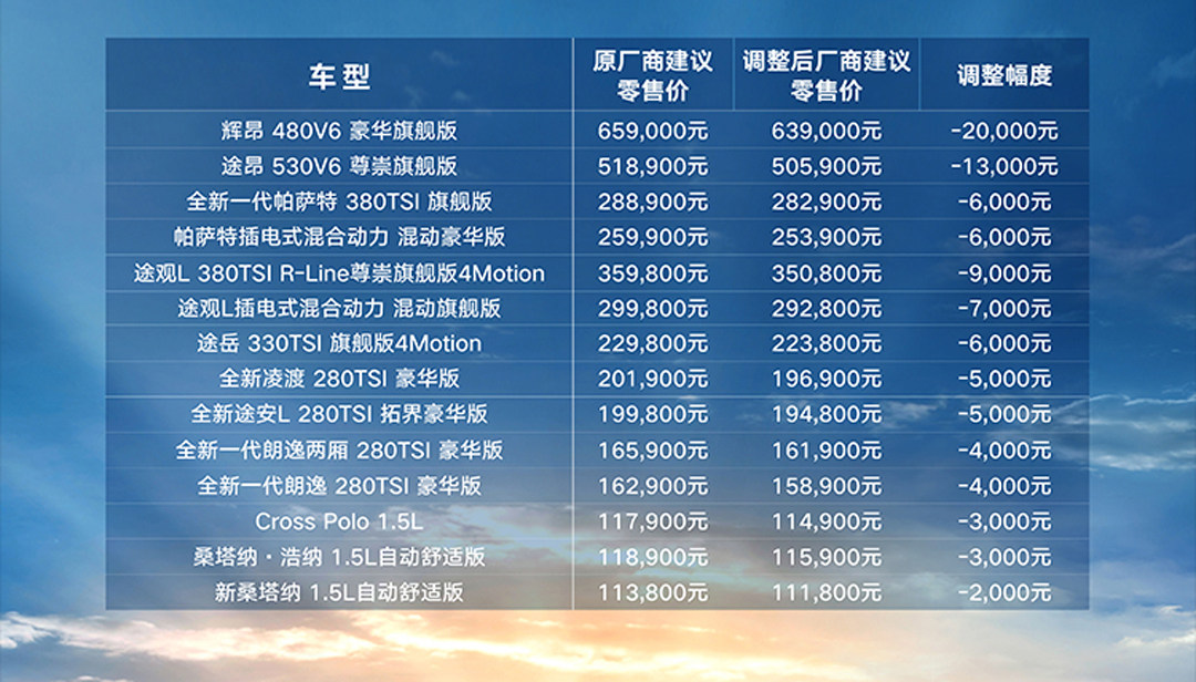 上汽大众全系车型,下调幅度从2000元至20000元不等,轿车方面,全新一代帕萨特380TSI 旗舰版降幅为6,000元;全新一代朗逸最高降幅为4000元。SUV产品方面,旗舰大型SUV途昂最高降幅为13000元;中型SUV途观L最高降幅为9000元;途岳最高降幅达6000元。