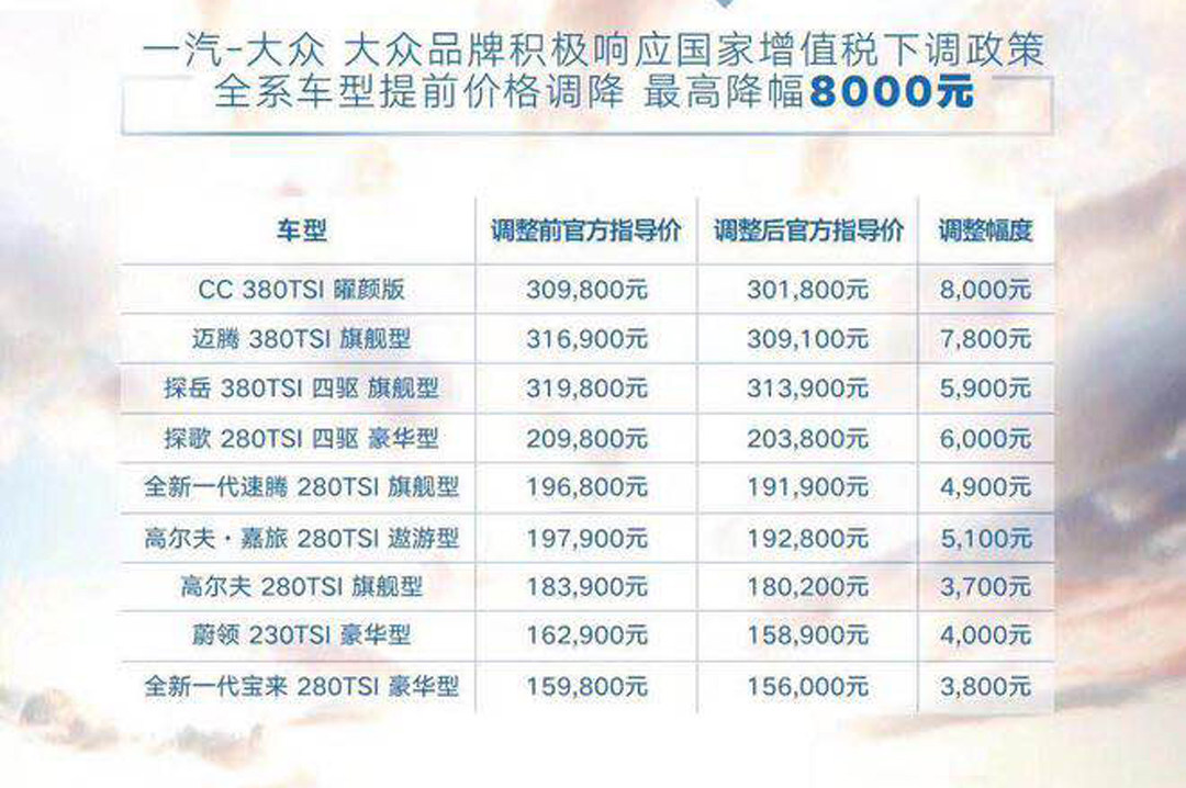 一汽-大众调整全系在售车型价格,CC 380TSI曜颜版下降8000元,速腾380TSI旗舰版下降7800元,全新上市的宝来和速腾售价也进行了小幅度下调。