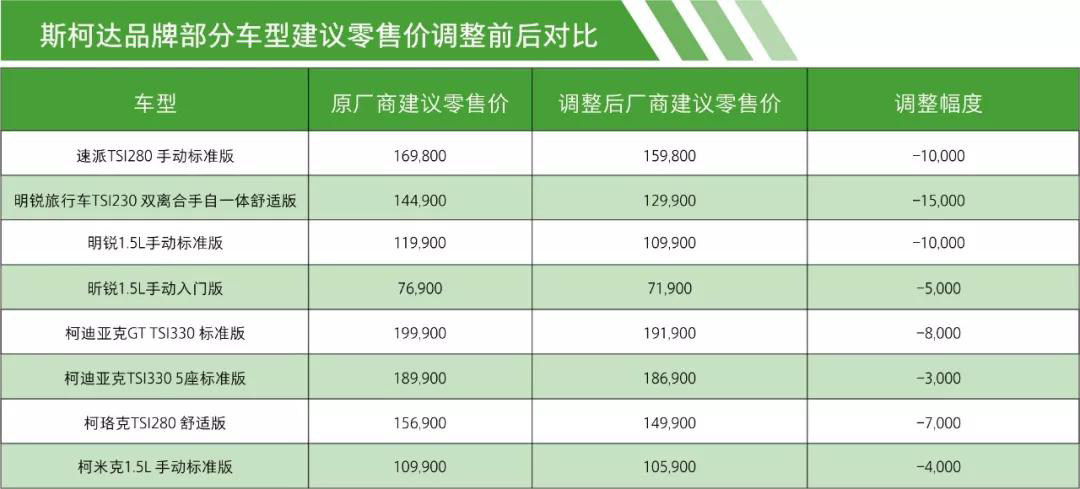 斯柯达品牌中,明锐旅行车TSI230 双离合手自一体舒适版降幅最高为15000元,柯迪亚克TSI 330标准版降价3000元,其余车型降价幅度也在3000-8000元不等。