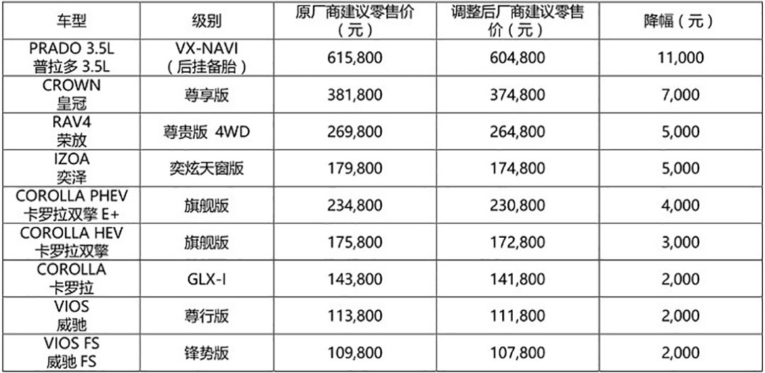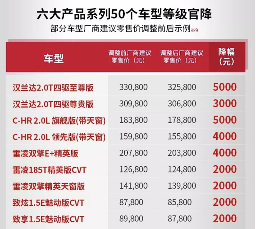 下调部分在售车型官方指导价。其中,汉兰达2.0T四驱至尊版厂商建议零售价调降5000元、2.0T四驱尊贵版厂商建议零售价调降3000元,2.0T四驱豪华版进行配置体验升级。同时,C-HR全系列厂商建议零售价调降3000元-5000元;雷凌和雷凌双擎全系列调降2000元-3000元;雷凌双擎E+全系调降4000元,致炫、致享全系列调降1000元-2000元。热销的凯美瑞没有出现在降价名单当中。