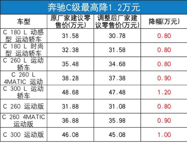 奔驰方面,AMG车型最高降幅达6.4万元,迈巴赫车型最高降幅为6万元,奔驰车型最高降幅4万元,热销的奔驰C级降价幅度0.8-1.2万元,smart品牌车型最高降幅7,000元。